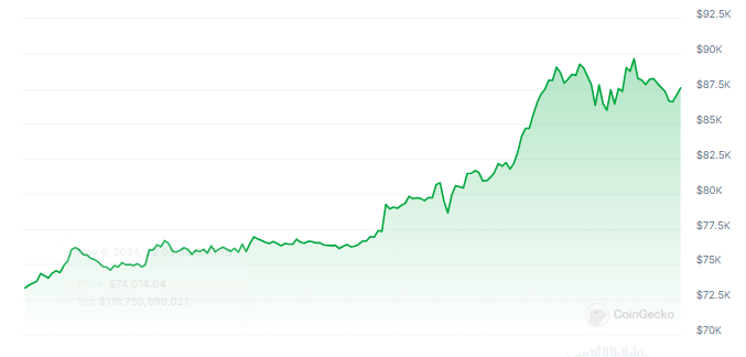 At the time of writing, Bitcoin was trading at $87,509, up 2.1% and 17.2% in the daily and weekly timeframes, data from Coingecko shows.