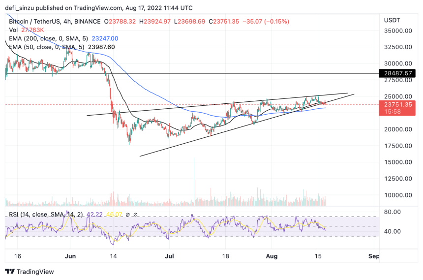 At the point of writing, the price of BTC is at $23,800, narrowly above the 50 Exponential Moving Average (EMA), which corresponds to $23,400.