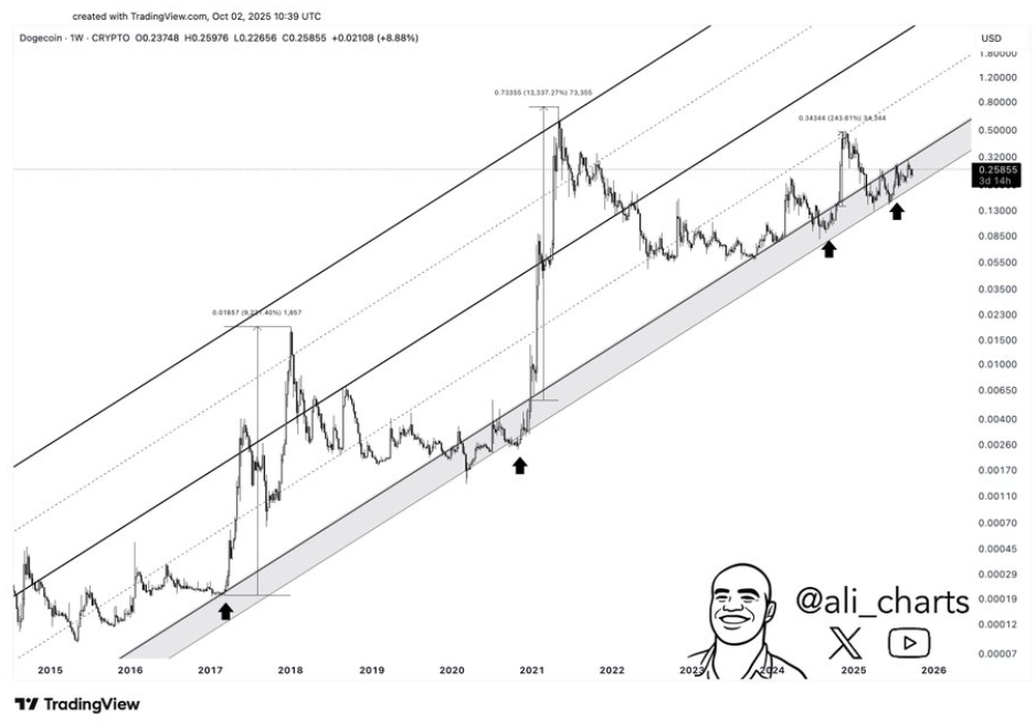 EtherNasyonaL, another crypto analyst, is more aggressive with Dogecoin. According to his projection, Dogecoin has now completed a successful retest after breaking above a descending trendline of lower highs. The most recent 3-day candlestick now shows Dogecoin forming a bullish candle above $0.25, and now the next step is a bullish leg to new all-time highs.