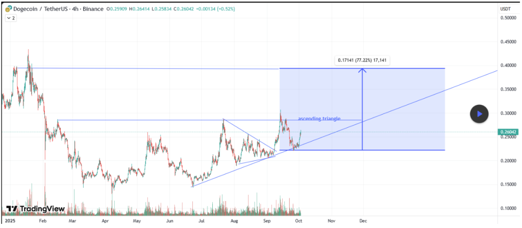 Dogecoin has been consolidating in a clear nine-month ascending triangle and is now approaching a key breakout point, according to a TradingView analysis. The pattern has been forming since early 2025 with rising support around $0.22 and a horizontal resistance zone between $0.28 and $0.30.