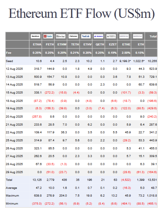 Friday’s outflows were a jarring departure from the steady gain that had defined Ethereum’s Spot ETFs since August 21. Ethereum’s six-day inflow streak, which had added about $1.876 billion, was brought to an abrupt end with the outflows on Friday. As a result, total assets under management for Spot Ethereum ETFs dipped to $28.58 billion.
