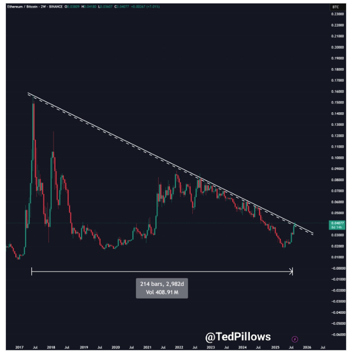 The analysis, which is based on the 2-week (2W) timeframe of the ETH/BTC pair, shows Ethereum’s price action breaking decisively above a long-term descending trendline that has held since 2017. At the time of the analysis, the ETH/BTC pair was trading around 0.04077 after a 7% price gain for Ethereum.