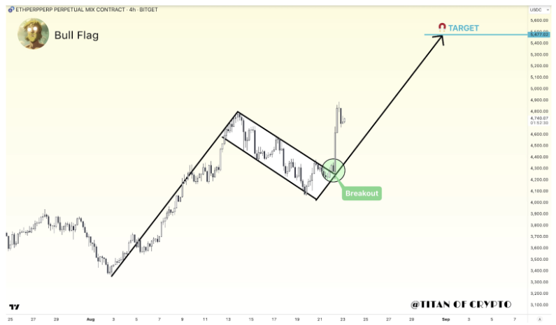 Another analyst, Titan of Crypto, noted a bullish setup on the shorter-term 4-hour ETH/USD chart. Technical analysis of the 4-hour candlestick timeframe chart shows Ethereum is currently breaking out of a well-defined bull flag formation, which is a continuation pattern that typically appears in the middle of a trend.