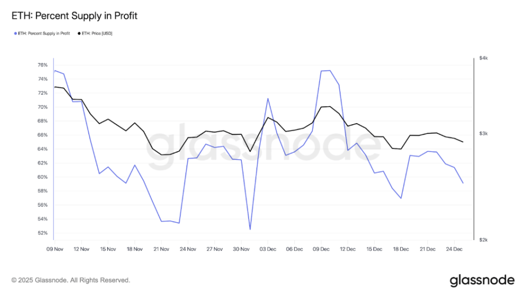 As ETH broke below $3,000 again, the share of supply held at unrealized gains fell under 60%, down from above 70% earlier in December. This fall shows that the pullback has not been limited to recent buyers but has begun to impact investors who accumulated during the beginning of the month.
