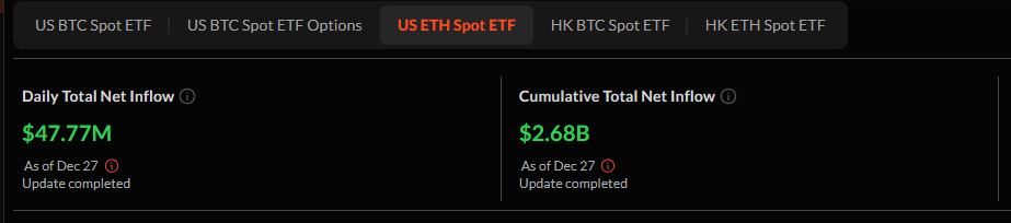 On December 27, the total net assets of ETFs exceeded $12 billion as a result of the nearly $48 million in daily inflows, data from SoSoValue shows. The Ethereum ETF offered by BlackRock has garnered the majority of these investments, underscoring the institutional interest in ETH in defiance of the recent price decline.