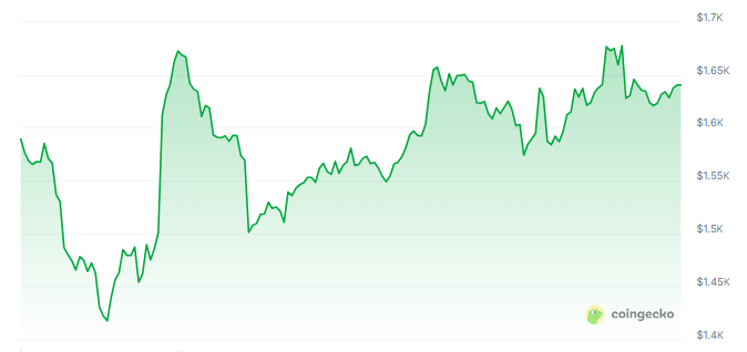 Ethereum has risen nearly 5% in the past 24 hours, trading at $1,675, which is a 10% rise in the past week. The second-largest cryptocurrency recovered strongly after touching a multi-year low of $1,380 recently.