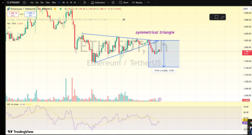 Bit Bull, a cryptocurrency expert, noted recently on X that Ethereum extricated itself from a symmetrical triangle after it retreated below $1,820. A breakdown of this nature usually translates into a bearish sentiment in the markets, which often means continuing downward price action.