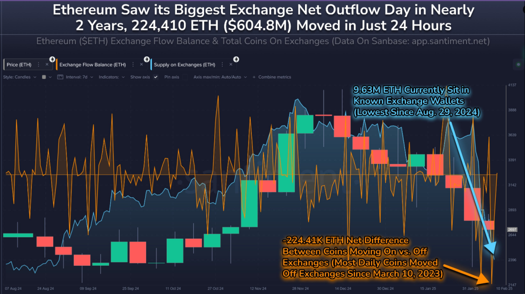 Ethereum tokens to the tune of 224,410 were pulled out of exchanges in the last 48 hours, causing a huge wave of withdrawals that have rocked the cryptocurrency scene. According to Santiment data, the massive exodus that took place on February 8 and 9 represents the largest net outflow in almost two years.