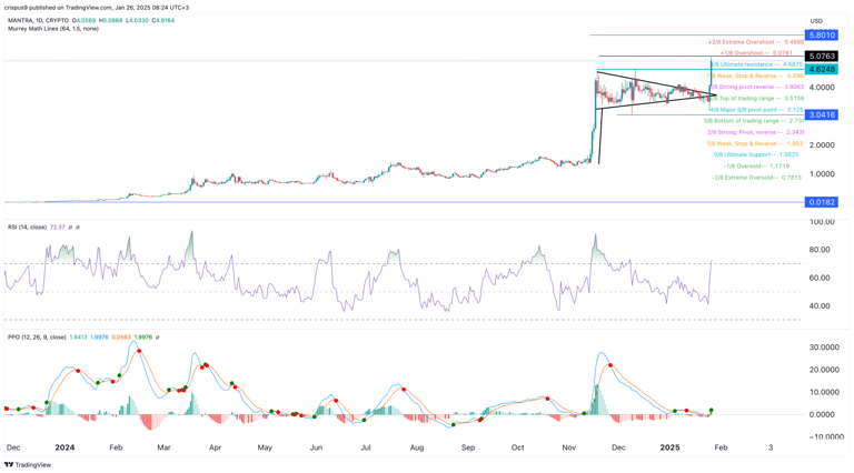 Il prezzo di Mantra è rimasto al di sopra di tutte le medie mobili, un segno che gli investitori sono in controllo. Inoltre, ha superato la resistenza finale delle Murrey Math Lines e si sta avvicinando al punto di overshoot a $5,0781.