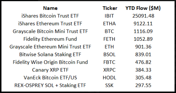 According to data shared by Nate Geraci, President of NovaDius Wealth, Bitcoin and Ethereum ETFs dominated year-to-date inflows.