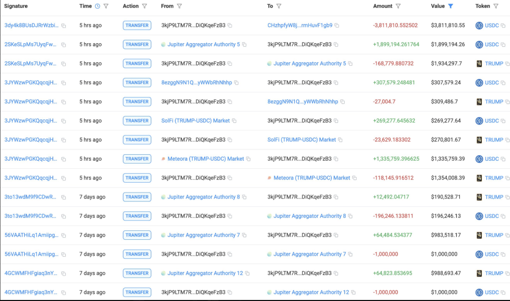 The wallets who sold behind it had previously made profits on TRUMP, but this time they exited early incurring heavy losses. Wallet 3kjP9L sold 337,560 tokens for $3.80 million and ended up in a loss of $1.38 million. It is reported that this wallet had previously profited by $196,000 from the same token.