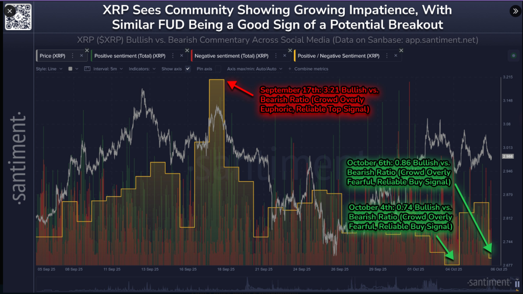 😮 XRP is seeing it’s highest level of retail FUD since Trump’s tariffs were announced 6 months ago. There have been more bearish comments than bullish for 2 of the past 3 days, which is generally a promising buy signal. Markets move opposite to small trader expectations. pic.twitter.com/flO7jjlo9m