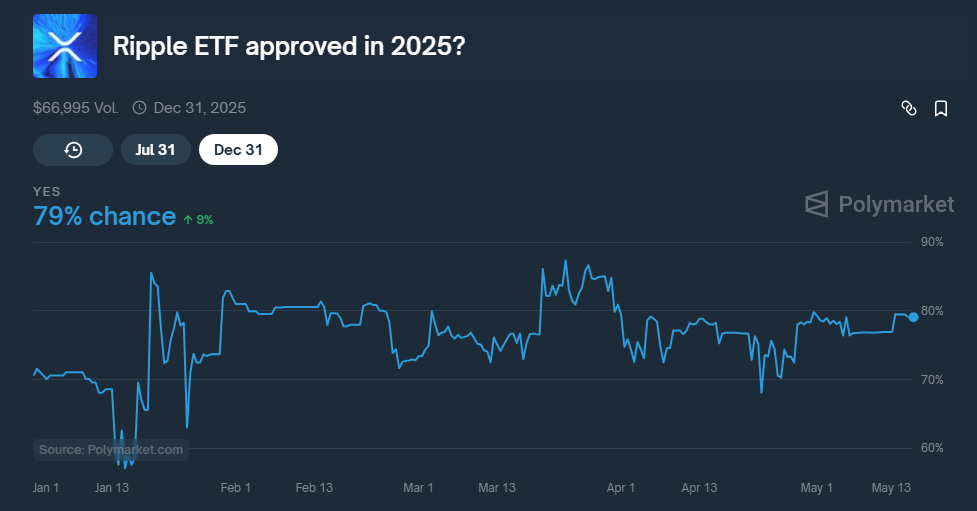 Based on market‑prediction platforms like Polymarket, there is an 79% chance the US Securities and Exchange Commission will approve spot XRP ETFs soon.