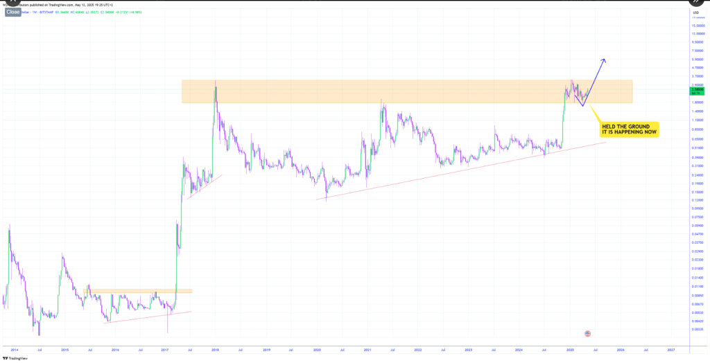 After holding as low as $1.60 in the recent downturn, XRP is now up 60% from that trough to return to $2.47, when this article was made. His chart suggests that this leg could carry XRP past the $5.00 mark. If that plays out, the token would more than double from today’s levels.
