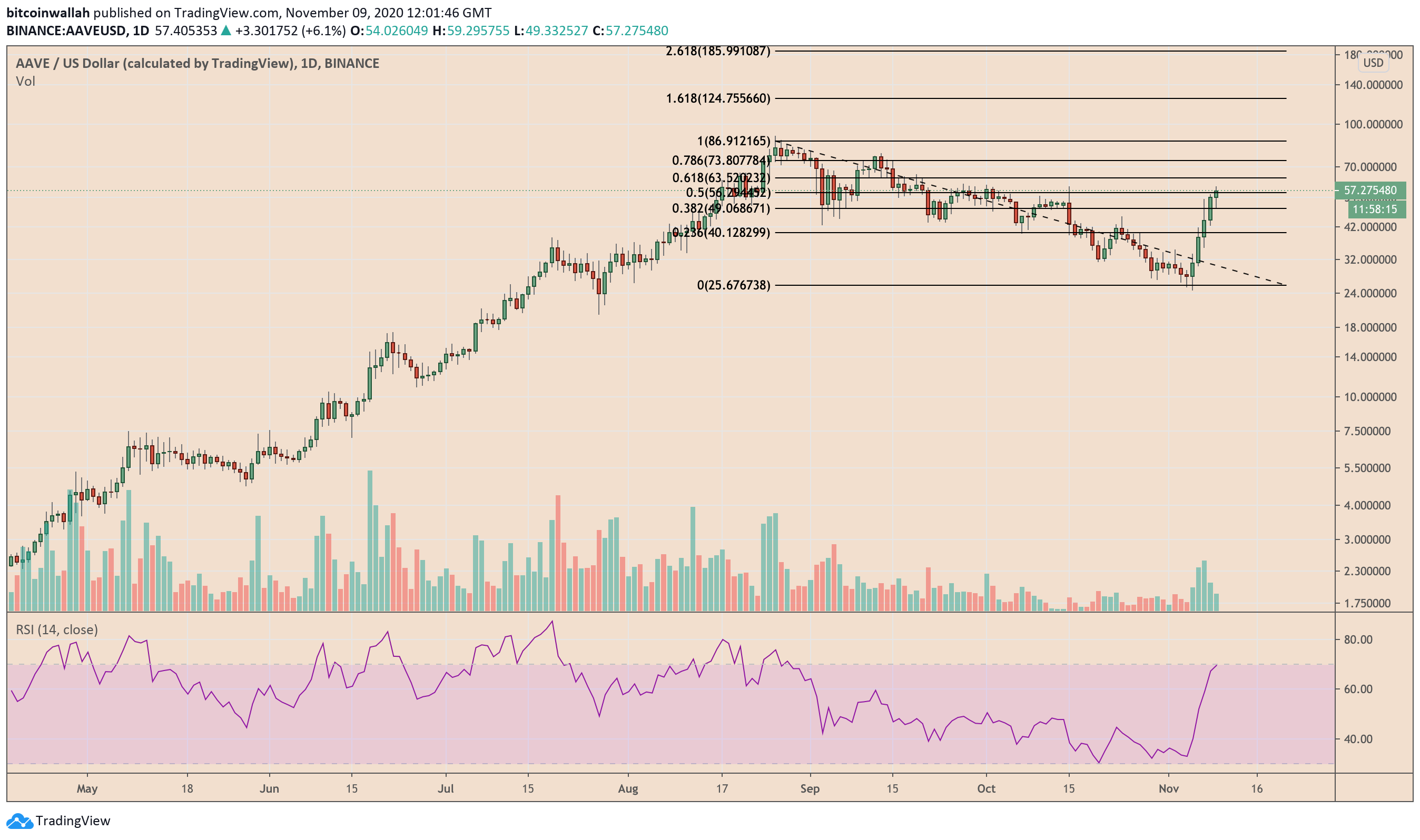 As of Monday, the token was attempting to break above $56.29, its interim resistance that coincides with the 50% Fibonacci level (as shown in the chart below). A clear upside gives AAVE/USD a lead towards $63.52. Market analyst Hsaka added: