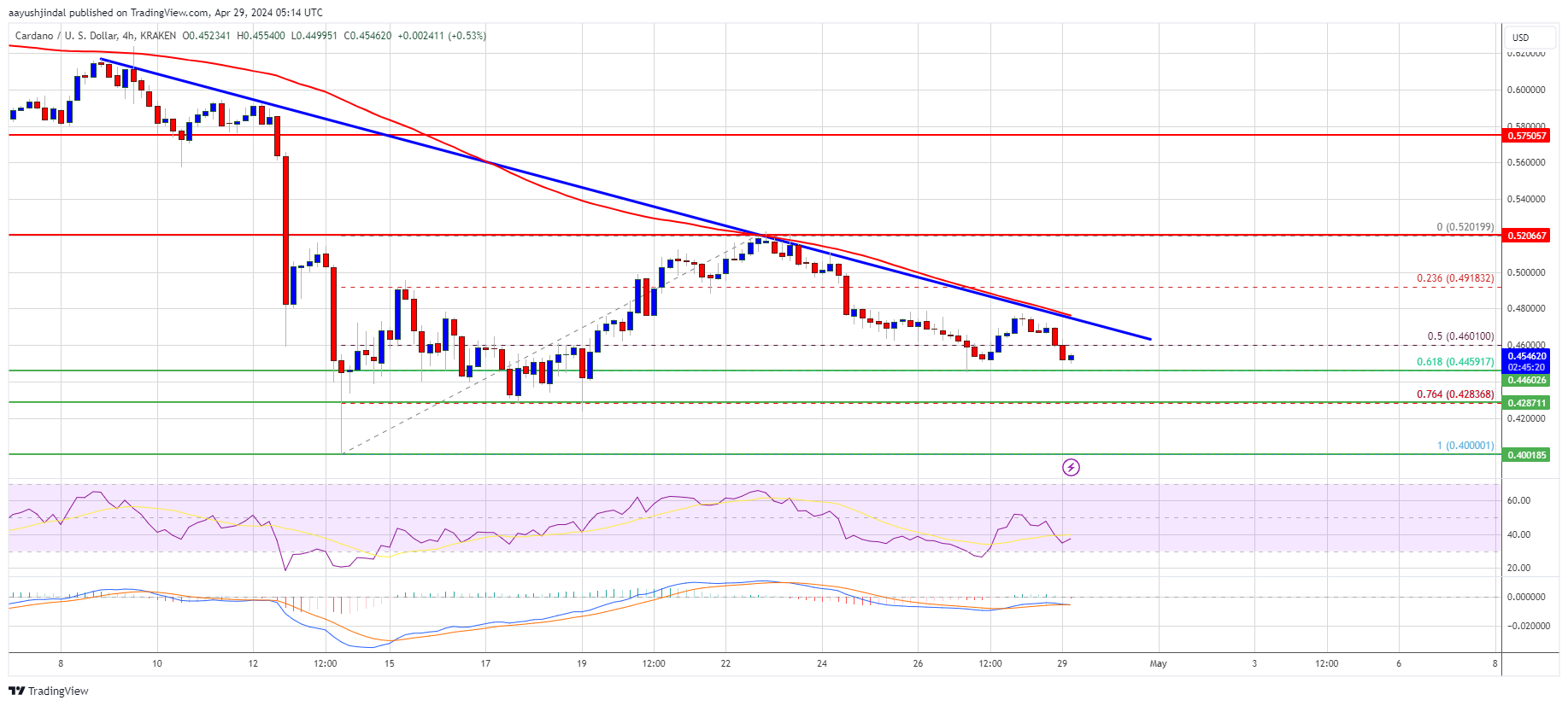 Major Support Levels – $0.4500, $0.4280, and $0.4000.