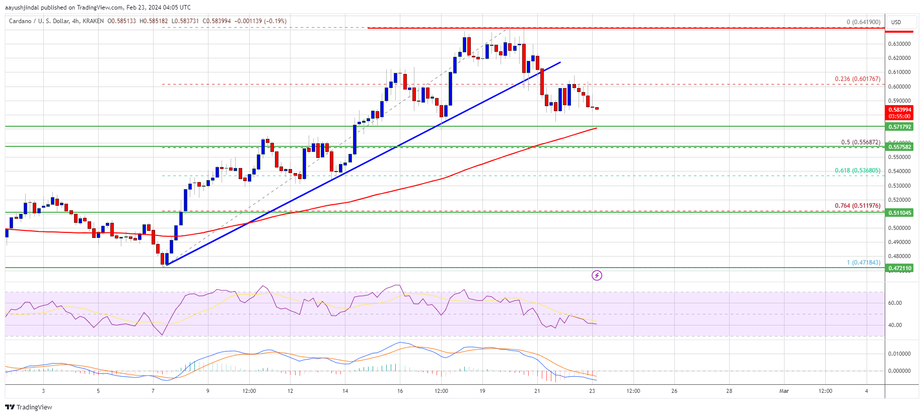 There was also a break below a key bullish trend line with support at $0.610 on the 4-hour chart of the ADA/USD pair. The price declined below the 23.6% Fib retracement level of the upward move from the $0.4718 swing low to the $0.6419 high.