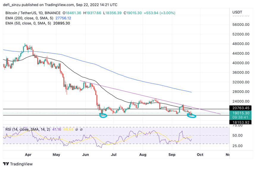 The price of Bitcoin (BTC) has had a rough week against tether (USDT) as the price plummeted following the Federal Open Market Committee news (FOMC). Following the news that the Federal Reserve raised its target interest rate by 75 bps, the price of Bitcoin (BTC) fell from $19,700 to a region of $18,100. (Data from Binance)