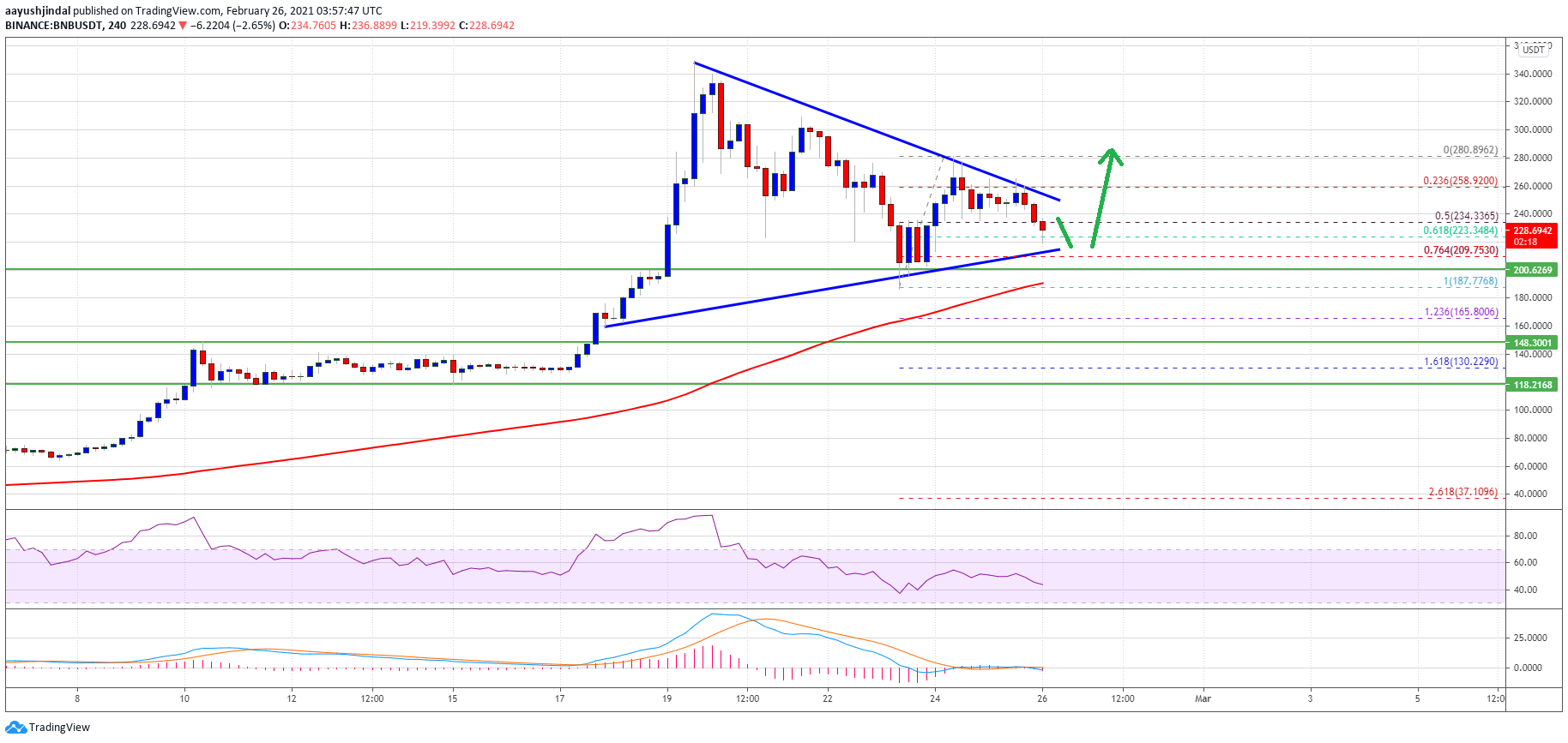 Binance coin price corrected sharply lower towards the $200 support against the USDT. BNB is consolidating and it is likely to rally again above $250 and $280.
