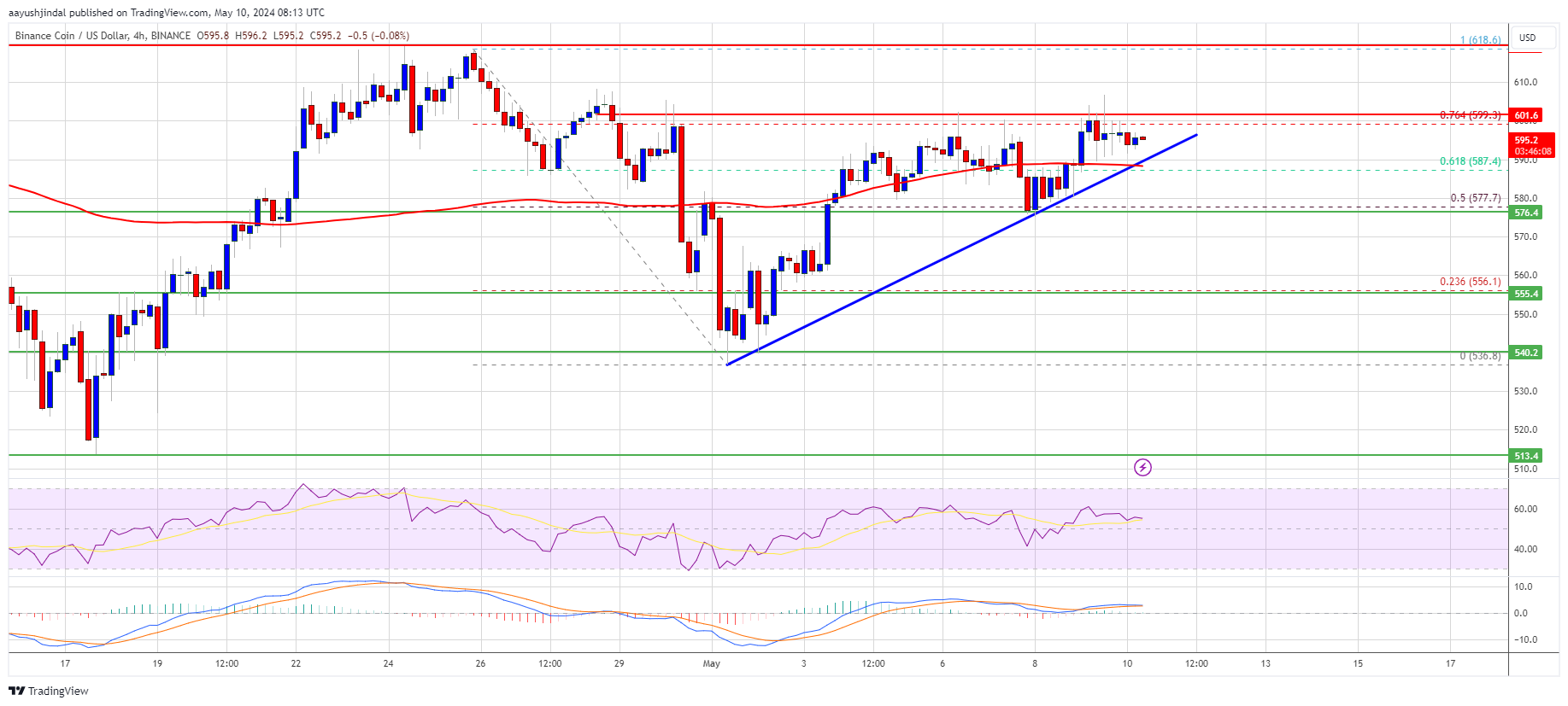 There is also a key bullish trend line forming with support at $592 on the 4-hour chart of the BNB/USD pair. The pair seems to be consolidating near the 76.4% Fib retracement level of the downward move from the $618 swing high to the $5382 low.