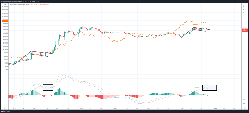 Comparing the total altcoin market cap sans BTC against the king itself, shows that alts might shockingly be undervalued by comparison. A similar shakeout in momentum can be seen during the last cycle using the LMACD, pictured below.