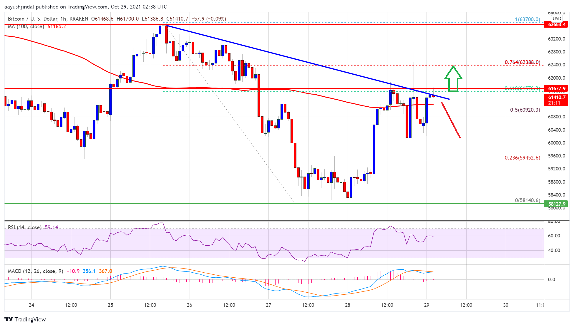 There is also a major bearish trend line forming with resistance near $61,650 on the hourly chart of the BTC/USD pair. Bitcoin is also facing barrier near the $62,000 level.