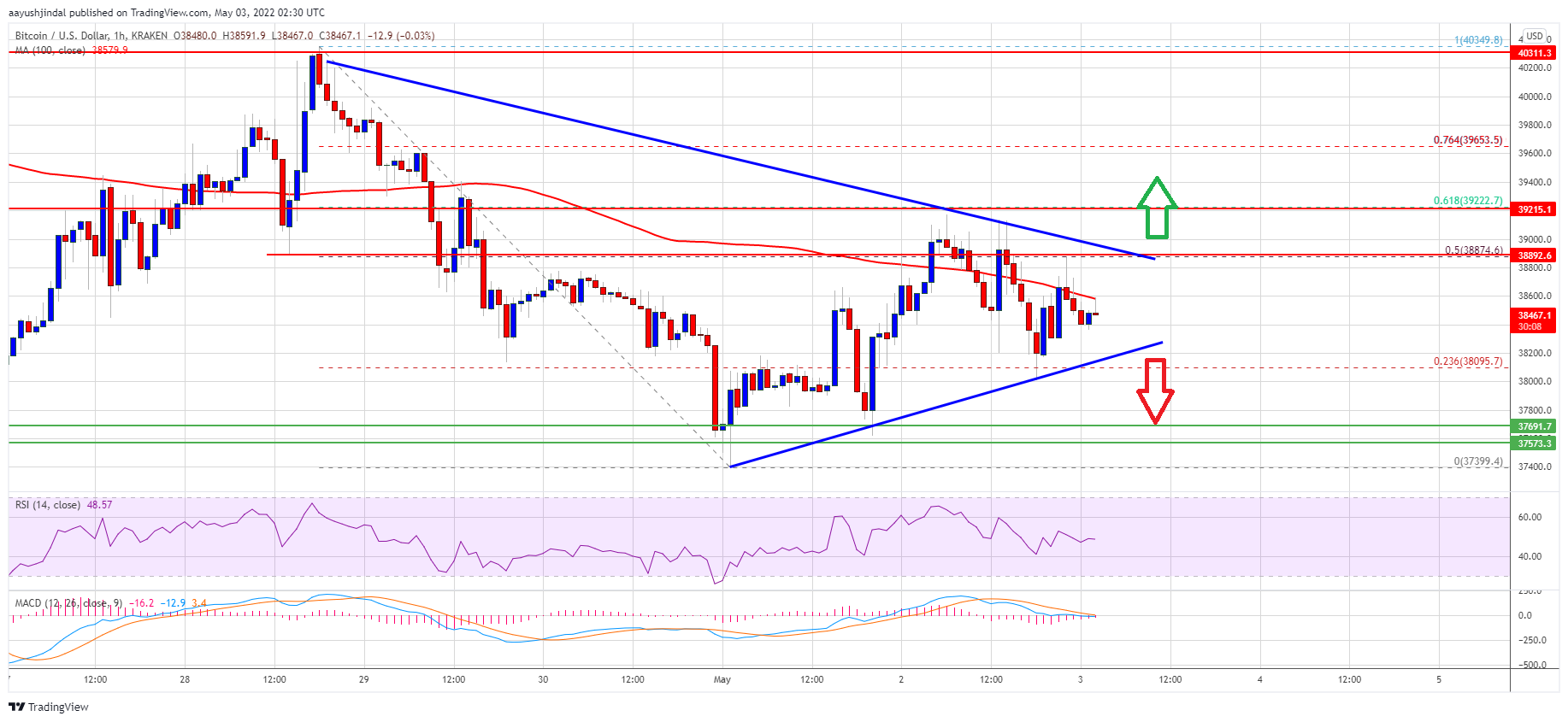 - There is a major contracting triangle forming with resistance near $38,880 on the hourly chart of the BTC/USD pair (data feed from Kraken).