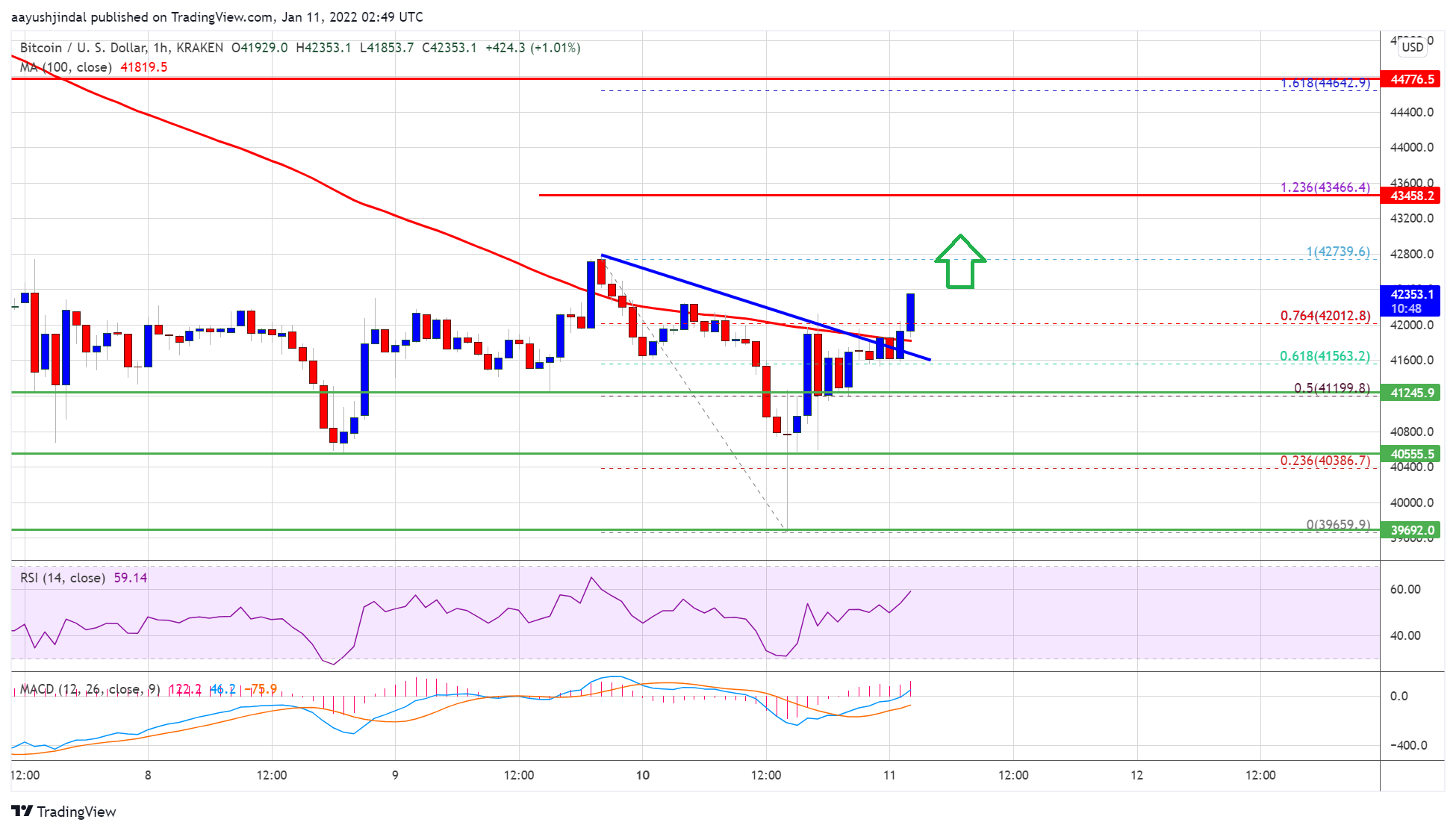- The price is trading above $42,000 and the 100 hourly simple moving average.