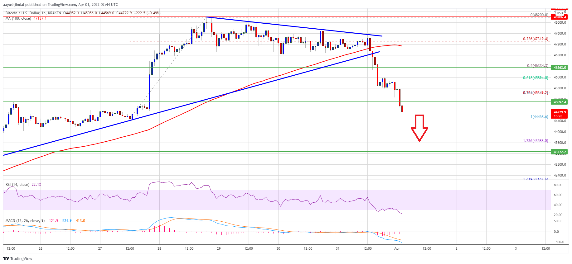 Besides, there was a break below a key breakout pattern with support near $46,800 on the hourly chart of the BTC/USD pair. Bitcoin is now trading below the 76.4% Fib retracement level of the upward wave from the $44,470 swing low $48,200 high.