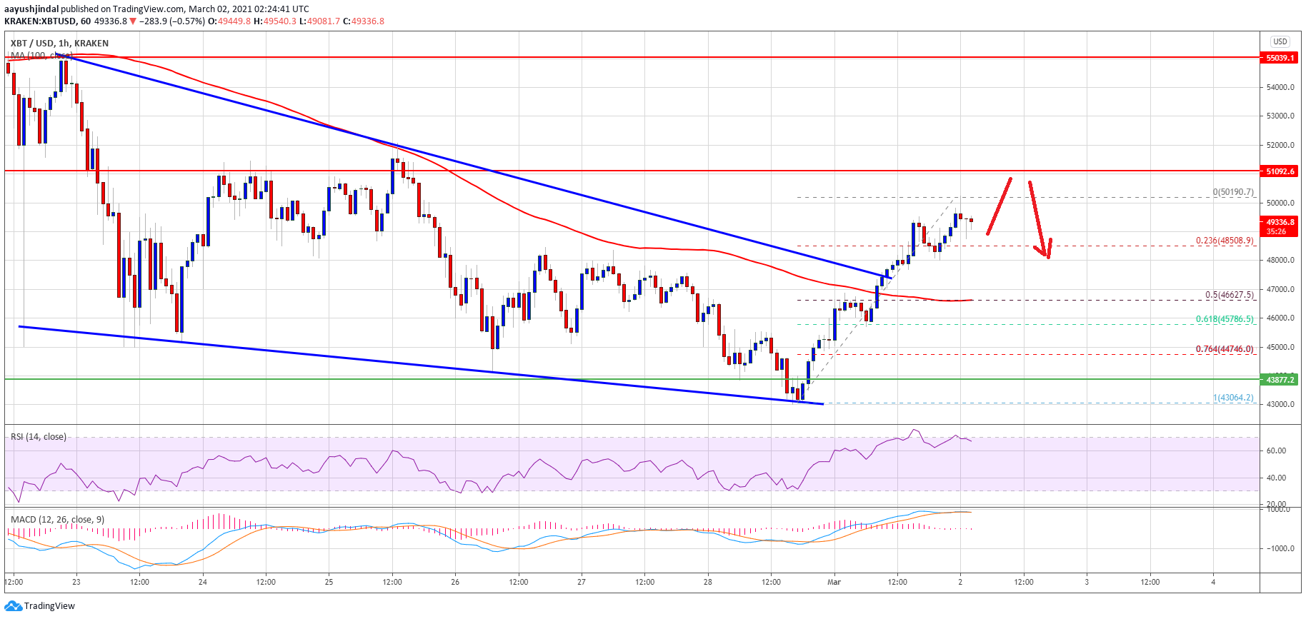 There was also a break above a major contracting triangle with resistance near $47,500 on the hourly chart of the BTC/USD pair. The pair broke the $48,000 resistance and it even spiked above the $50,000 level.