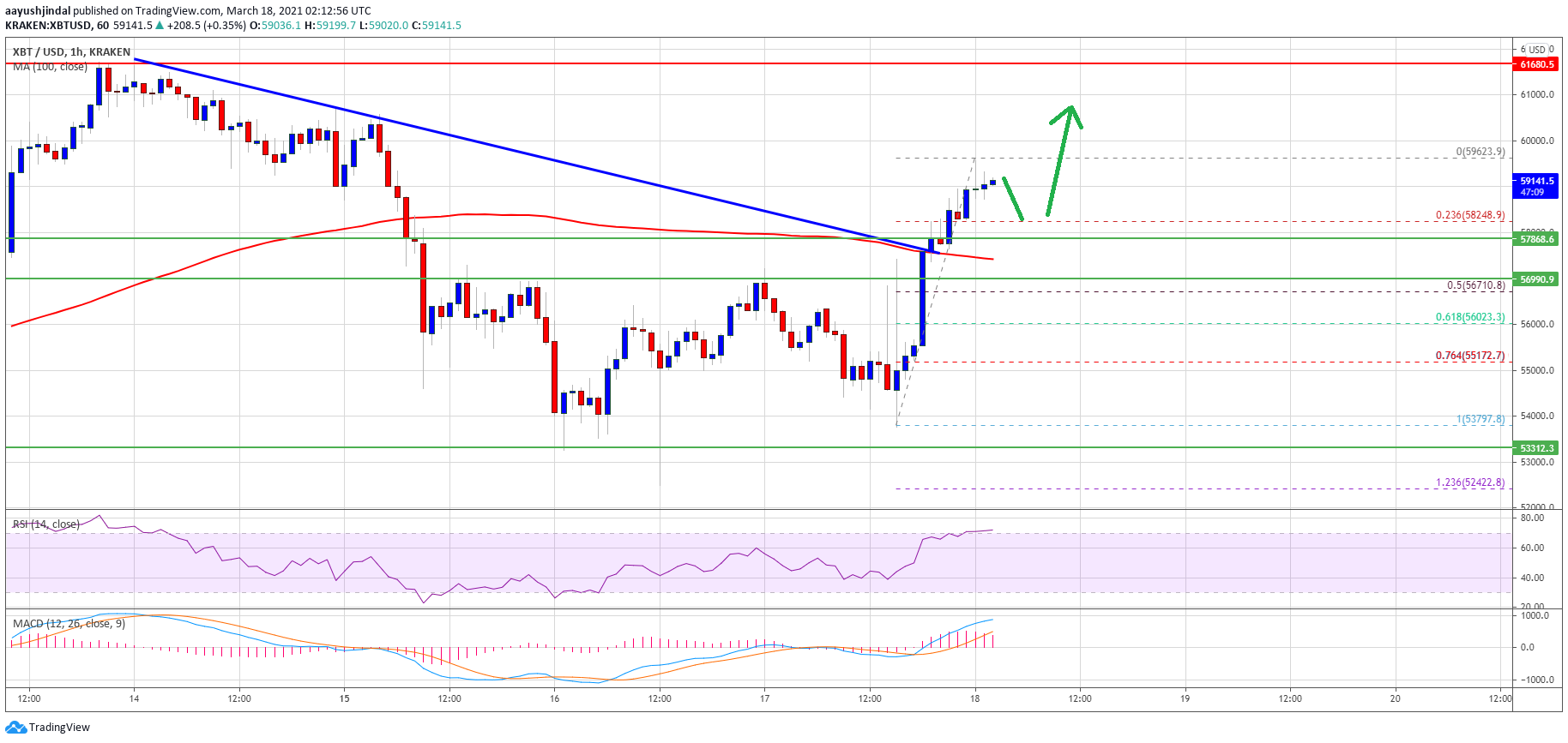 It opened the doors for more gains and the price even climbed above $59,000. A high is formed near $59,623, and the price is now well above the $58,000 resistance and the 100 hourly simple moving average.