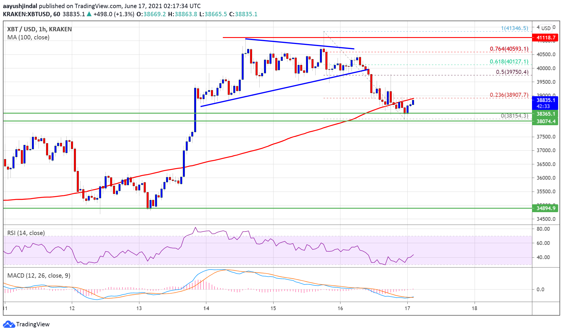 Bitcoin price started a downside correction from well above $40,000 against the US Dollar. BTC is now trading near a major support at $38,000, where the bulls are currently active.