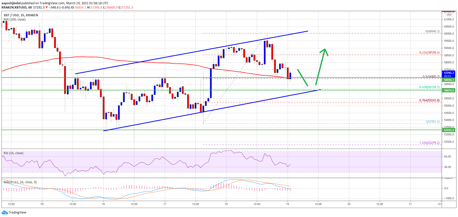 - There is a key rising channel forming with support near $56,150 on the hourly chart of the BTC/USD pair (data feed from Kraken).