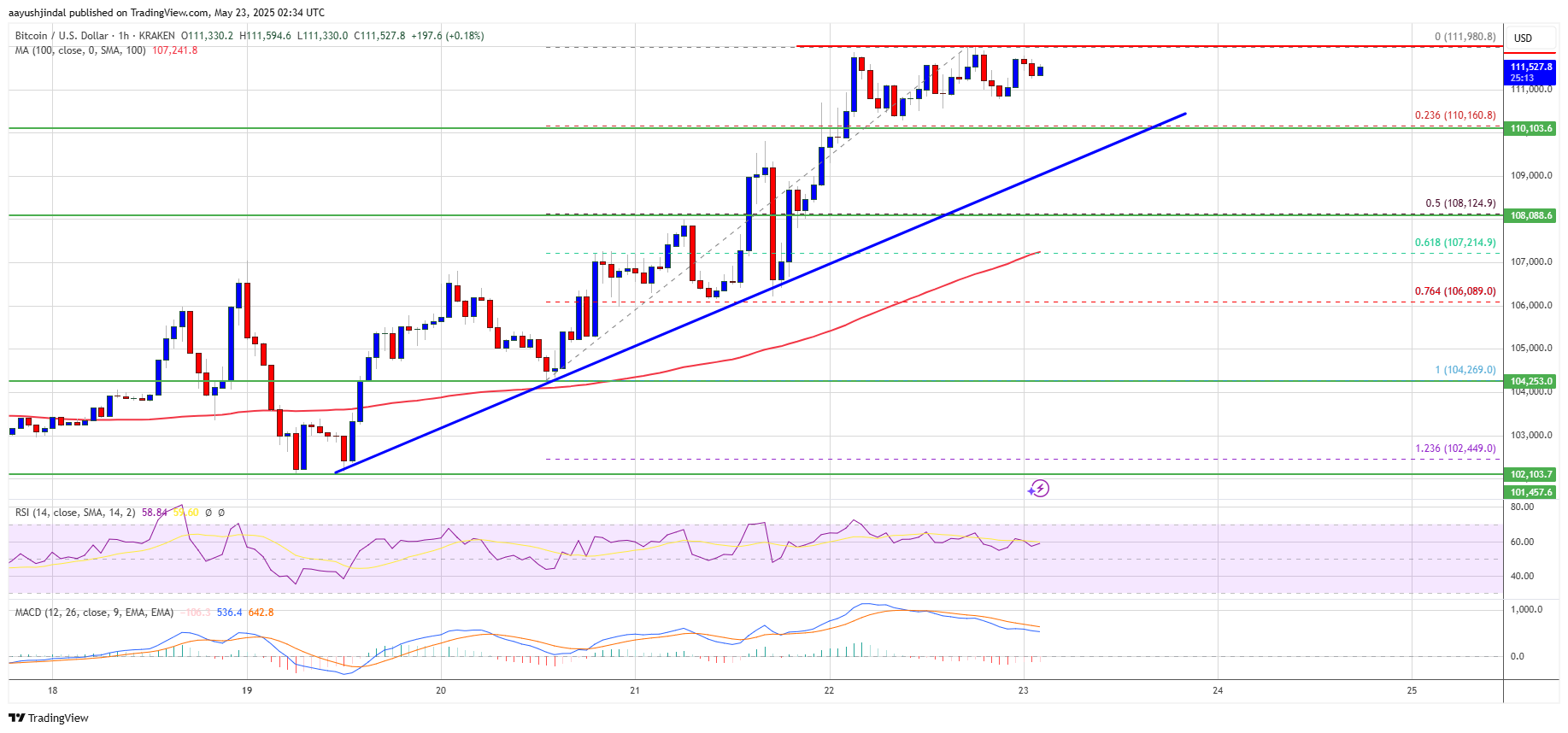 The bulls even pumped the price above the $111,500 resistance zone. The price traded to a new all-time high near $111,980 and is currently consolidating gains above the 23.6% Fib retracement level of the upward move from the $104,270 swing low to the $111,980 high.