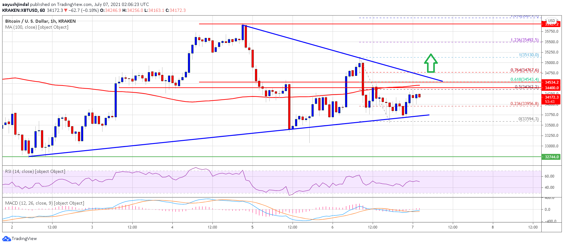 It climbed above the 23.6% Fib retracement level of the recent drop from the $35,130 swing high to $33,594 low. It seems like there is a major contracting triangle forming with support near $33,750 on the hourly chart of the BTC/USD pair.