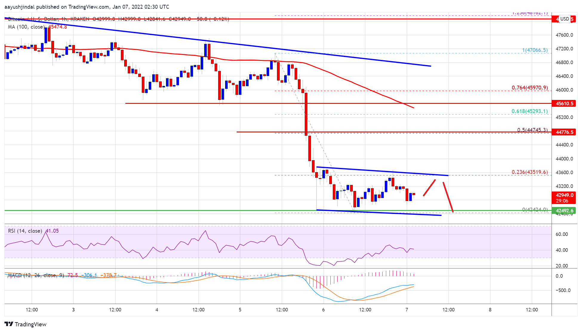 The price settled below the $43,500 level and the 100 hourly simple moving average. There was a clear move below the $43,000 level and the price traded as low as $42,424. It is now consolidating losses above the $42,500 level.