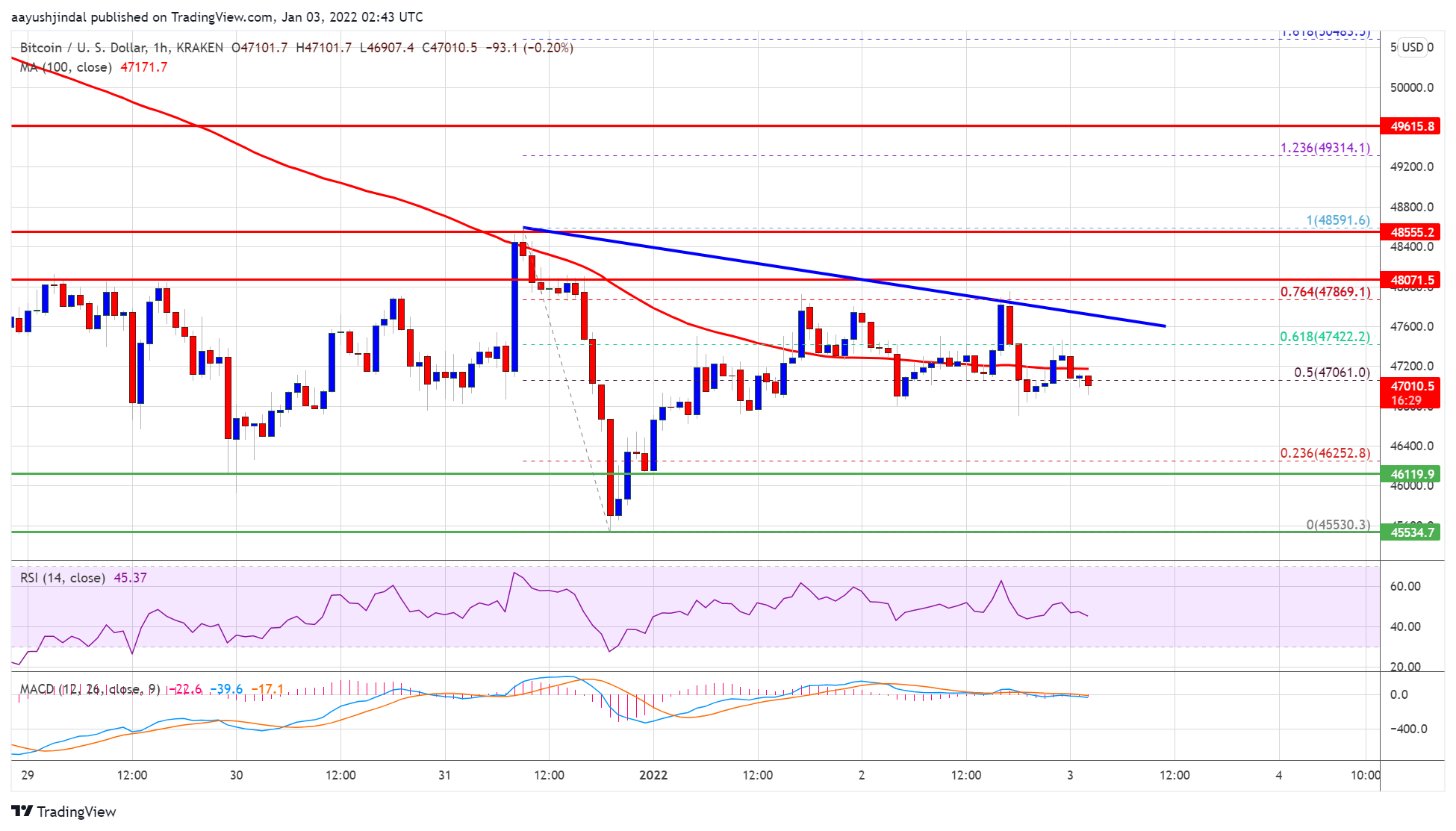 The decline gained pace below the $47,000 level and the 100 hourly simple moving average. A low was formed near $45,530 before the price started an upside correction. Bitcoin was able to recover above the $46,500 and $47,000 levels.