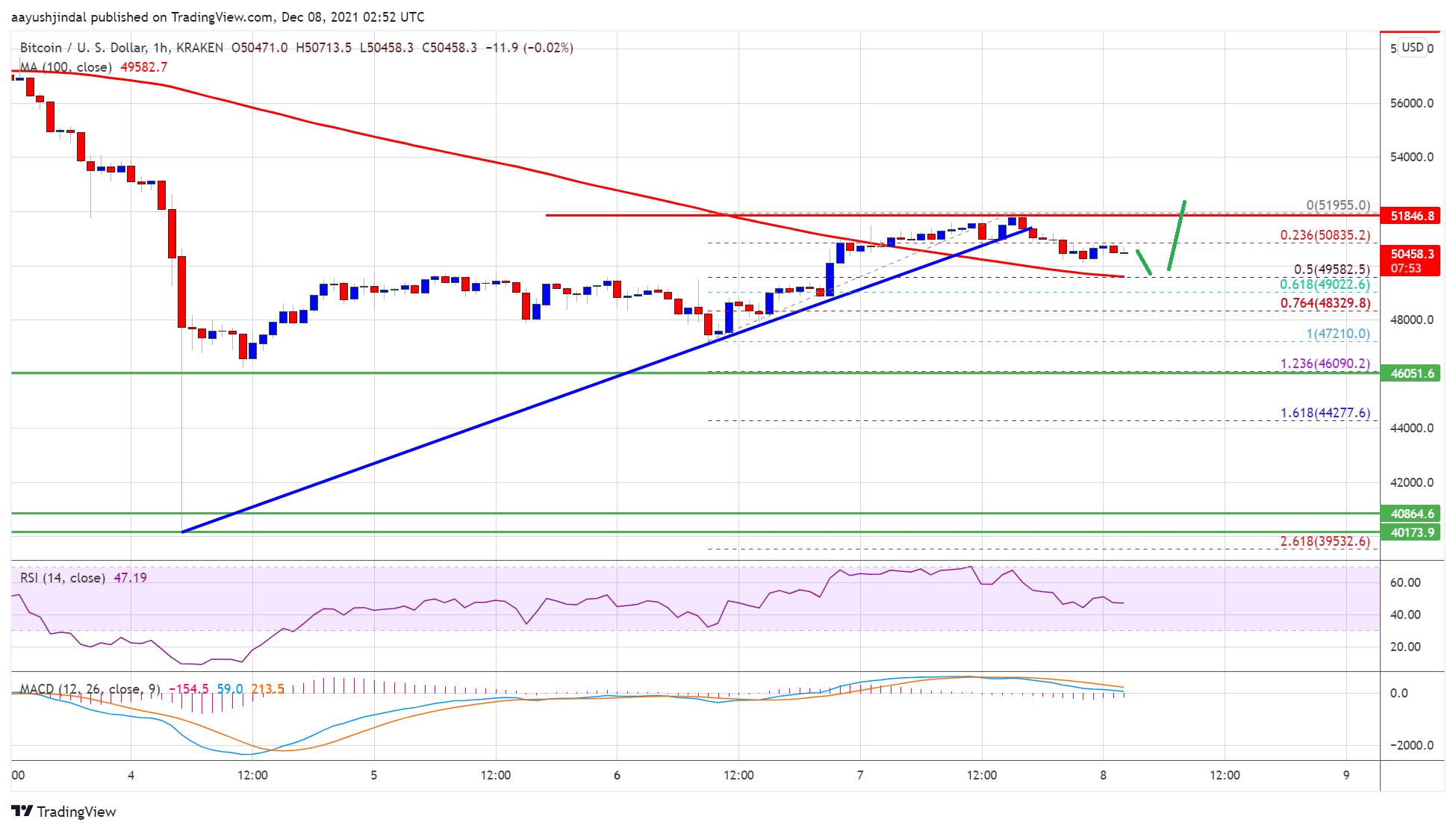 There was also a break below a connecting bullish trend line with support near $50,800 on the hourly chart of the BTC/USD pair. The pair is now trading above $50,000 and the 100 hourly simple moving average.