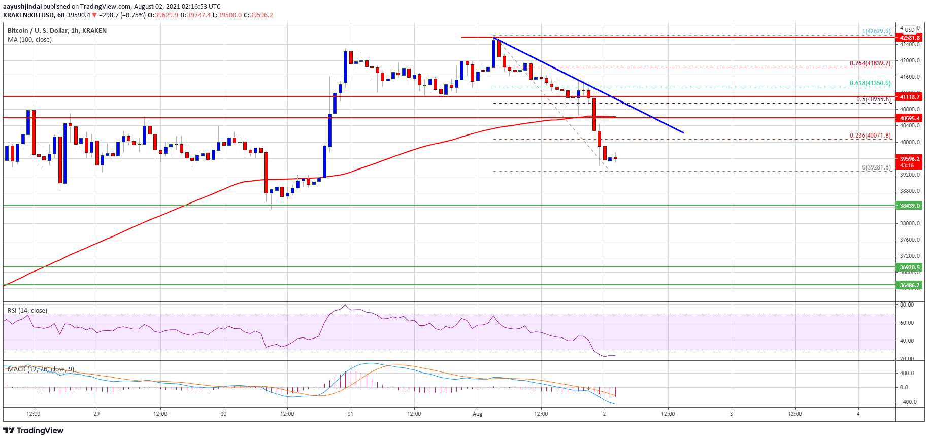 However, the price struggled above the $42,600 level. A high was formed near $42,629 before the price started a downside correction. There was a break below the $41,200 and $40,500 support levels. It even broke the $40,000 support level and the 100 hourly simple moving average.