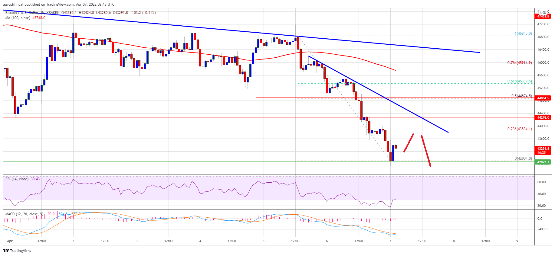 The price even broke the $45,000 support level and settled below the 100 hourly simple moving average. Finally, it spiked below the $43,000 level and traded as low as $42,904. It is now consolidating losses near the $43,000 level.