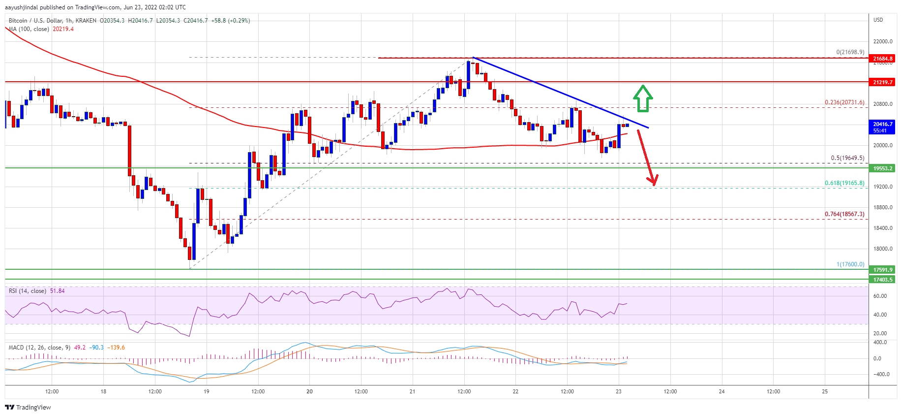 The price declined below the 23.6% Fib retracement level of the upward move from the $17,600 swing low to $21,700 swing high. The bears even pushed the price below the $20,500 support zone and the 100 hourly simple moving average.