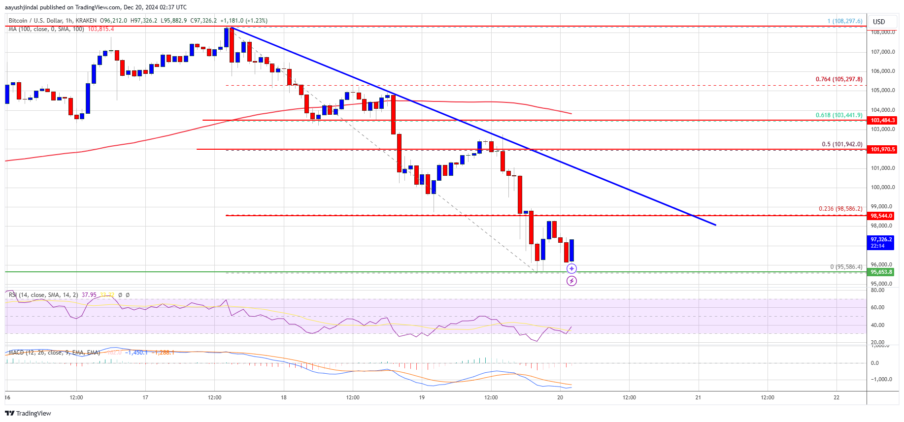 The price even spiked below $96,500. A low was formed at $95,586 and the price is now consolidating losses. There is also a key bearish trend line forming with resistance at $98,500 on the hourly chart of the BTC/USD pair.