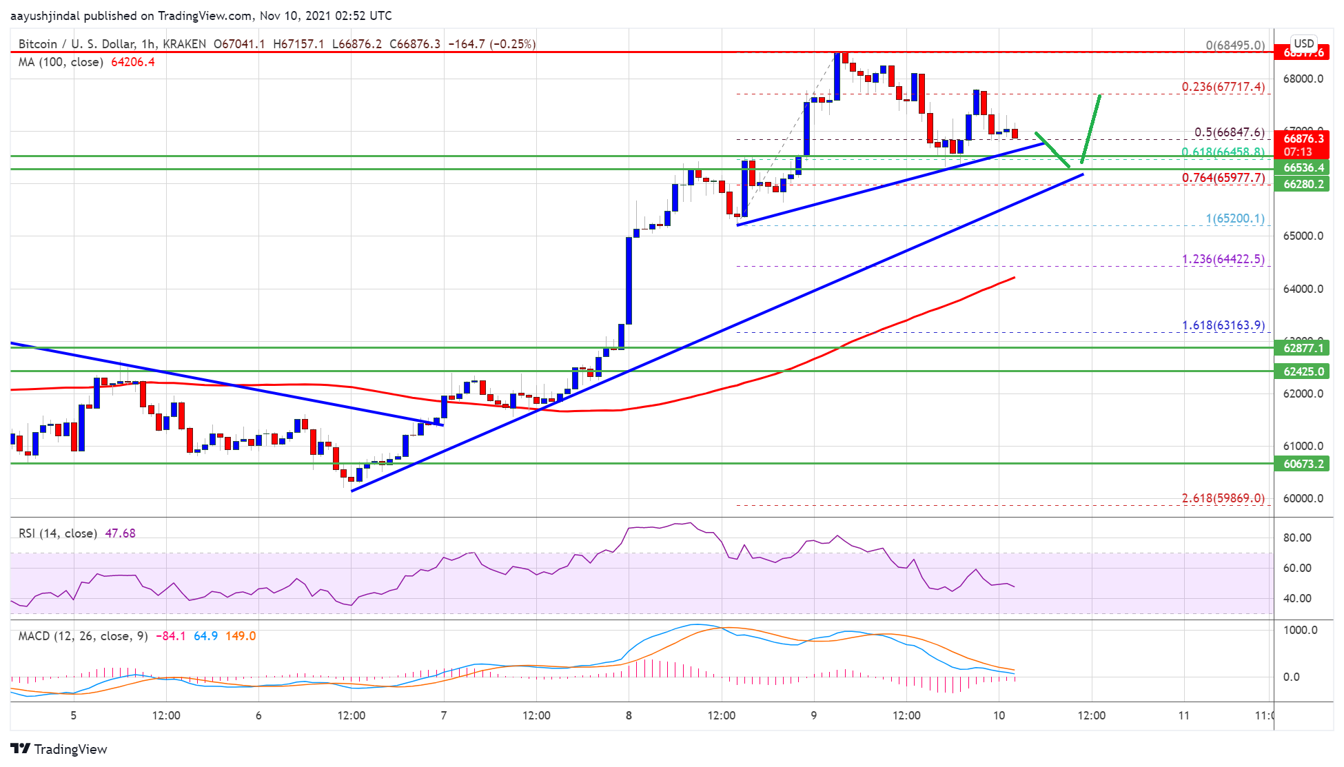 However, bitcoin still trading above $65,000 and the 100 hourly simple moving average. There is also a key bullish trend line forming with support near $66,000 on the hourly chart of the BTC/USD pair.