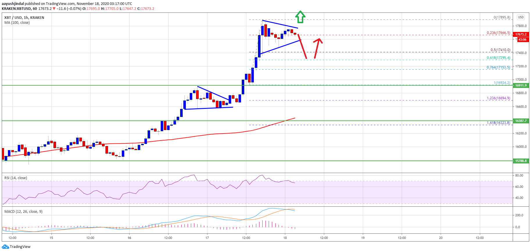 The price rallied over 6%, broke the $17,500 resistance, and settled well above the 100 hourly simple moving average. Bitcoin traded to a new monthly high at $17,895 and it is currently consolidating gains.
