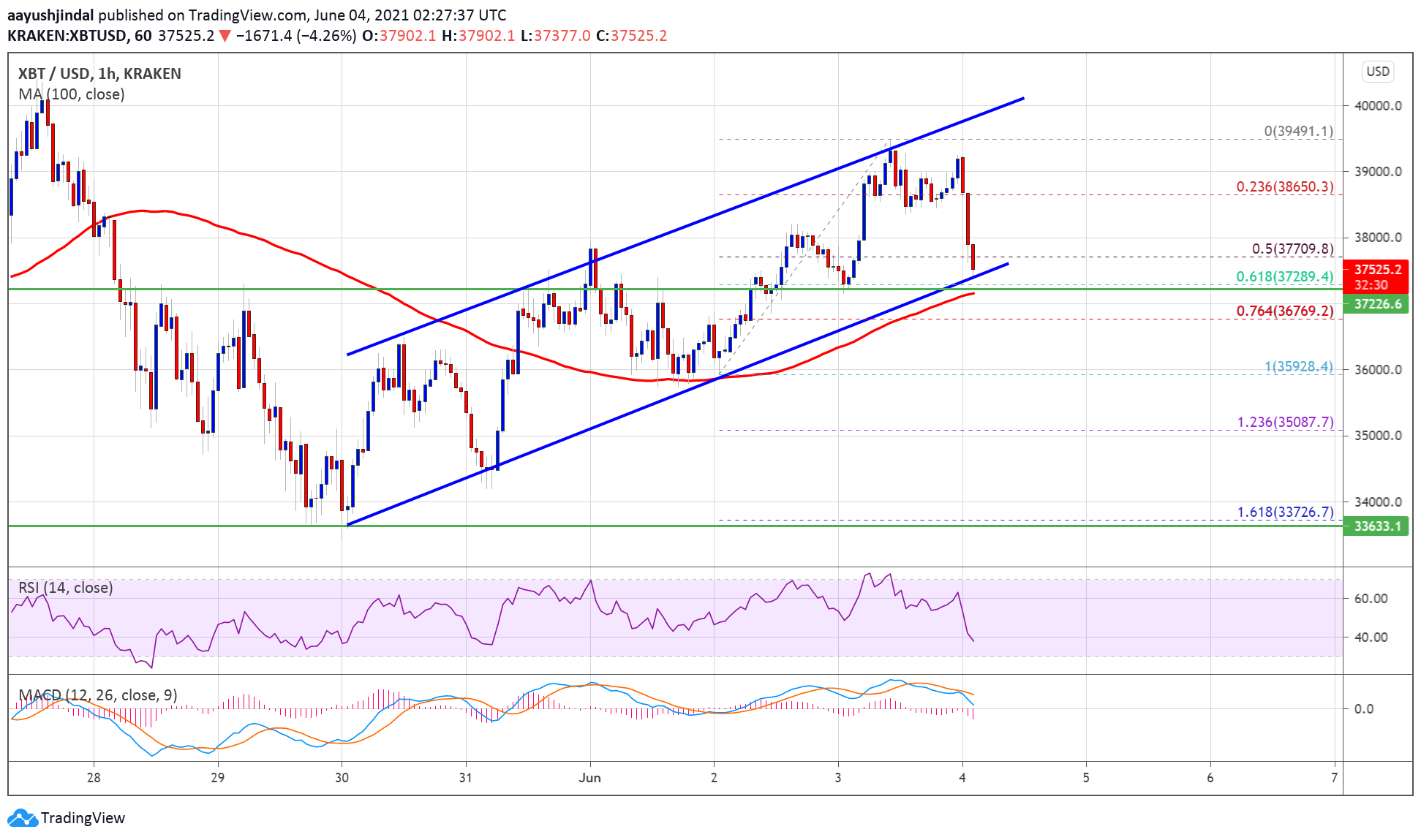 Bitcoin price climbed above the $38,000 resistance against the US Dollar, but it failed near $39,500. BTC is correcting lower and it might dive if it breaks the $37,000 support.