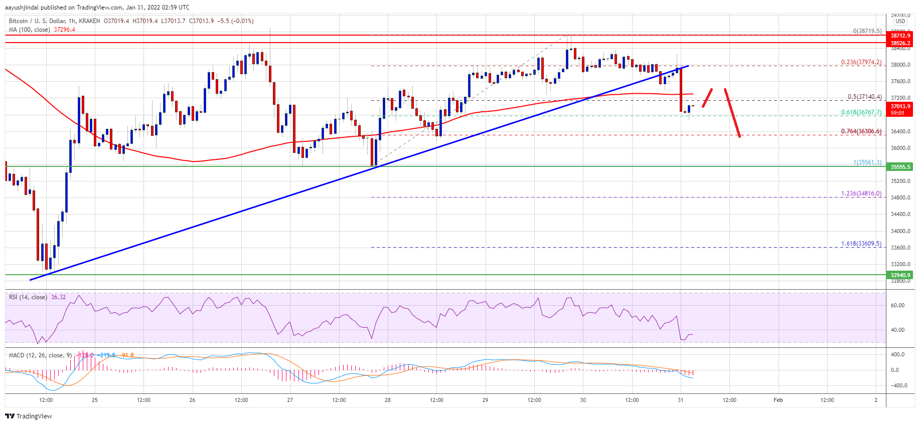 Besides, there was a break below a key bullish trend line with support near $37,650 on the hourly chart of the BTC/USD pair. The pair traded below $37,200 and the 100 hourly simple moving average.