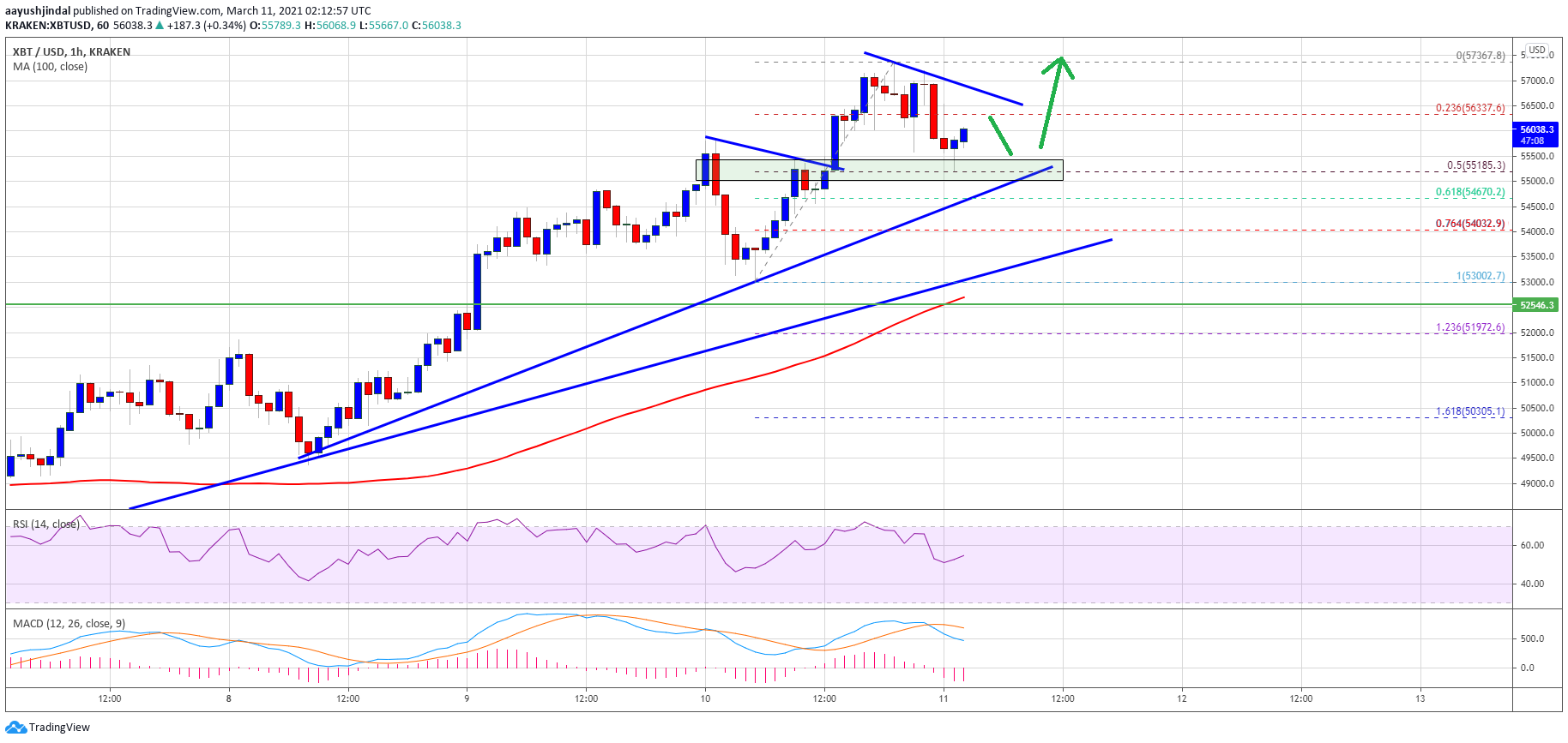 The bulls even pushed the price above the $57,000 resistance. A high is formed near $57,367 and the price is currently correcting lower. It traded below the 23.6% Fib retracement level of the upward move from the $53,002 low to $57,367 high.