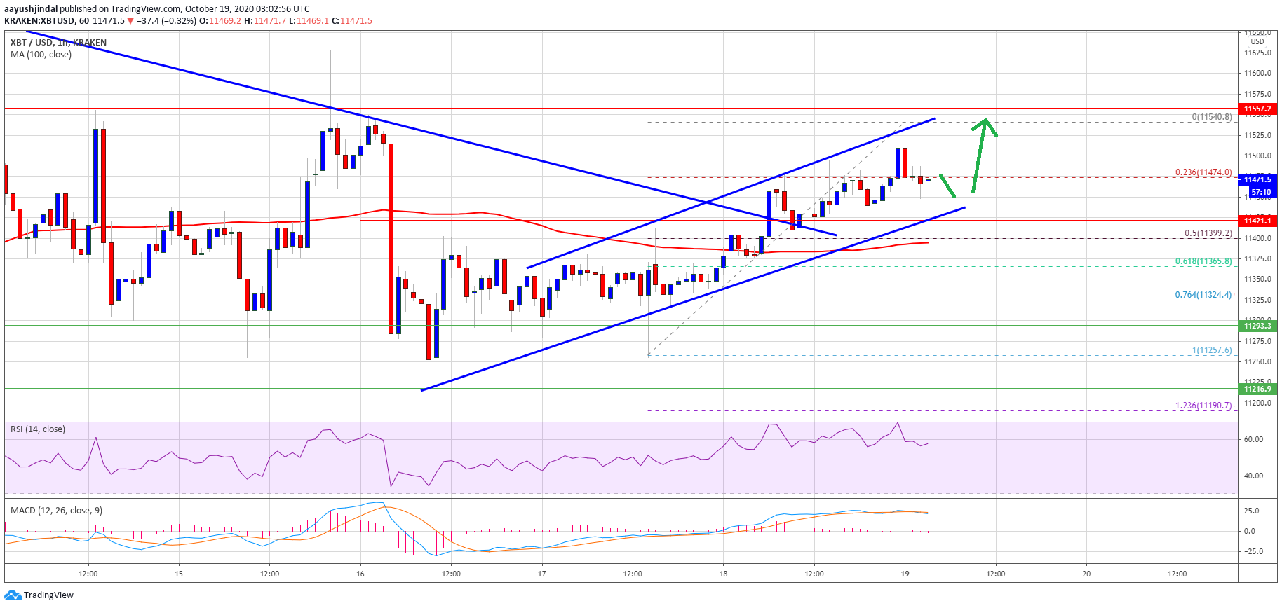 During the rise, there was a break above a connecting bearish trend line with resistance near $11,420 on the hourly chart of the BTC/USD pair. The price even spiked above the $11,500 resistance, but it seems to be facing hurdles near $11,560.