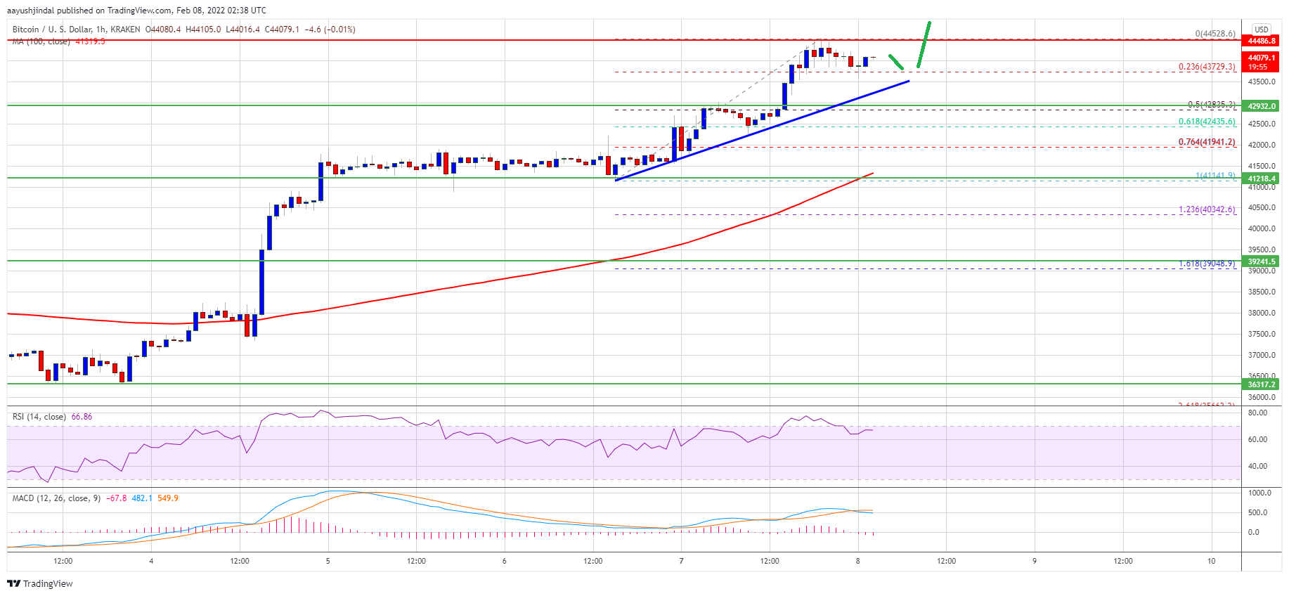The recent upward move gained pace above the $43,000 level. Finally, the price spiked above the $44,000 level and settled above the 100 hourly simple moving average. A high is formed near $44,528 and the price is now consolidating gains.
