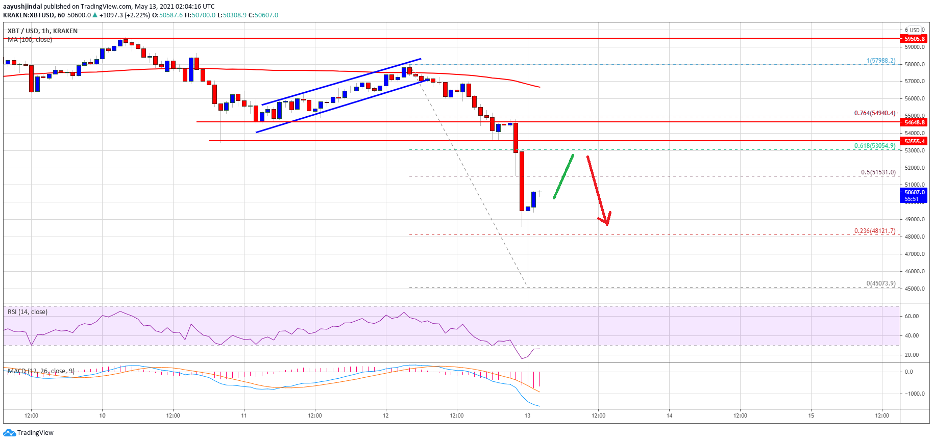 - Bitcoin started a major decline from well above $55,000 and it even traded close to $45,000
